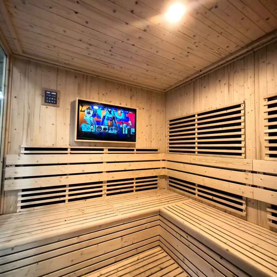 অন্তর্নির্মিত LCD টিভি (ছবিতে দৃশ্যমান) sauna অভিজ্ঞতাকে রূপান্তরিত করে: