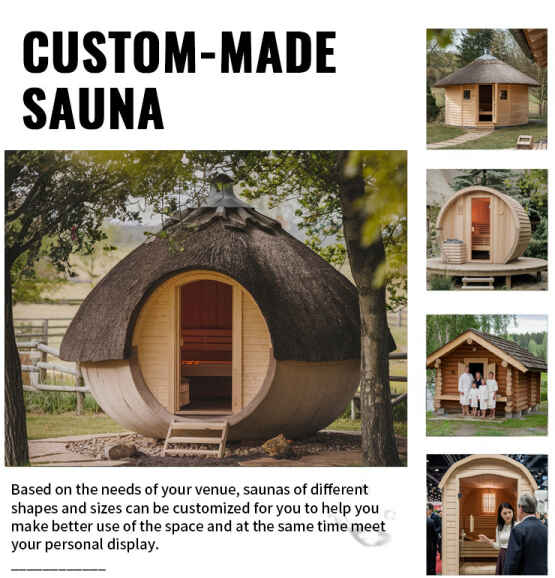 আকৃতি কাস্টমাইজেশন: বহিরঙ্গন-অভিযোজনযোগ্য আকারের উপর ফোকাস করে যেমন ব্যারেল-আকৃতির, কাঠের ঘর-আকৃতির, এবং গোলাকার, ভারসাম্যপূর্ণ স্থানের ব্যবহার এবং প্রাকৃতিক নন্দনতত্ত্ব। উঠান কোণে বা ক্যাম্পিং সাইট কিনা,বাইরের কাচের দরজা আউটডোর স্টিমিং রুমসবুজ গাছপালা এবং পাথরের মতো বাইরের পরিবেশের সাথে সুরেলাভাবে একত্রিত হতে পারে।