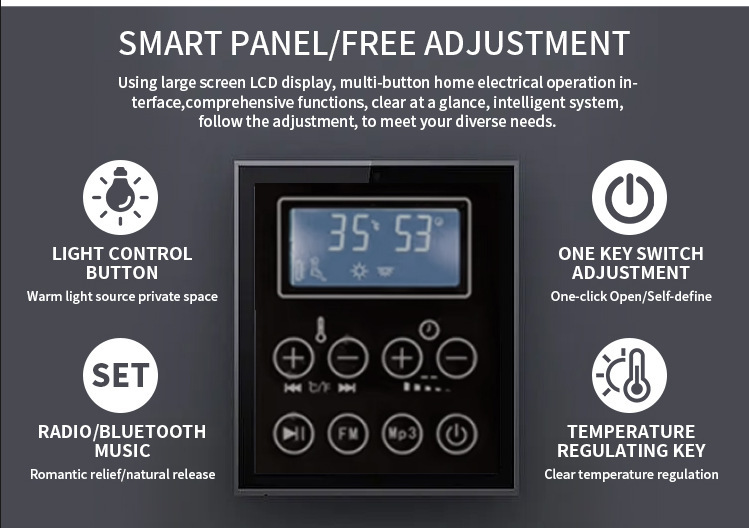 দবাইরের কাচের দরজা আউটডোর স্টিমিং রুমএকটি বহিরঙ্গন-নির্দিষ্ট বড়-আকারের LCD বুদ্ধিমান কন্ট্রোল প্যানেল (জলরোধী এবং ডাস্টপ্রুফ ডিজাইন) দিয়ে সজ্জিত, "এক-কী নিয়ন্ত্রণ" সুবিধাজনক অপারেশন উপলব্ধি করে: