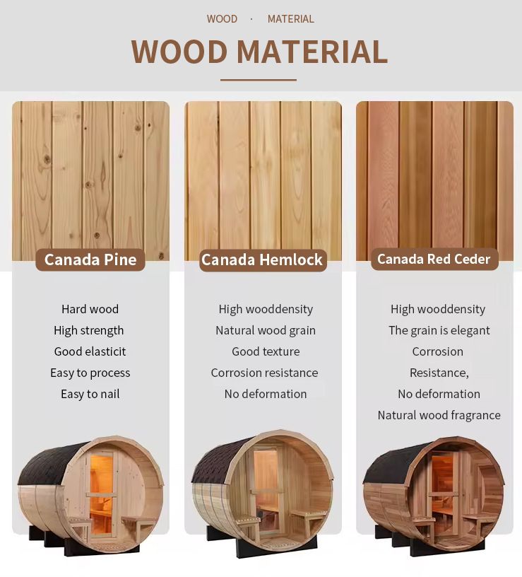 কাঠ কাস্টমাইজেশন: উচ্চ-মানের কানাডিয়ান আমদানি করা বহিরঙ্গন-নির্দিষ্ট কাঠ নির্বাচন করে - পাইন (উচ্চ কঠোরতা, সাশ্রয়ী, ক্ষয়রোধী চিকিত্সা), হেমলক (উচ্চ ঘনত্ব, আর্দ্রতা-প্রতিরোধী এবং বিকৃতি-প্রতিরোধী), এবং ওয়েস্টার্ন রেড সিডার (প্রাকৃতিকভাবে ক্ষয়রোধী, বাইরের কাঠের সুগন্ধের ভিন্নতা পূরণের জন্য, বহিরঙ্গন কাঠের সুগন্ধি প্রয়োজন। জন্য পরিবেশবাইরের কাচের দরজা আউটডোর স্টিমিং রুম.